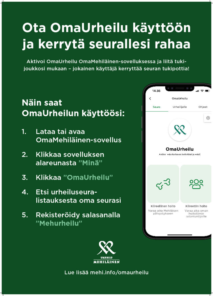 Lataa OmaMehiläinen ja ota OmaUrheilu käyttöön alla olevien ohjeiden mukaisesti. Jokaisesta uudesta jäsenestä saamme Urheilu Mehiläiselle näyttöä, että koripalloilijoiden huoltoa ja hoivaa kannattaa keskittää enemmän ja enemmän juuri Kouvolaan 💚☺️