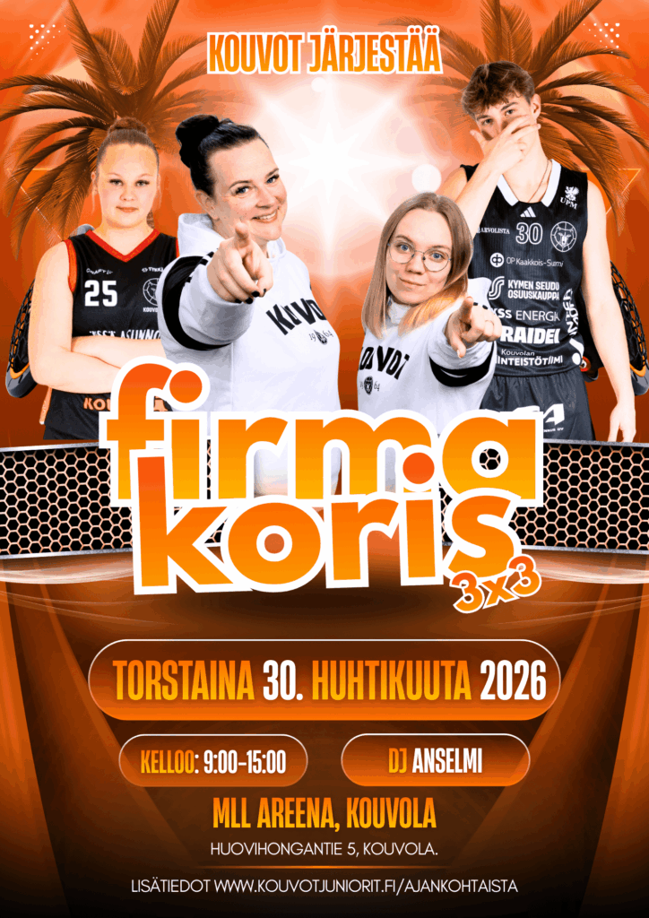 Kouvot Juniorit järjestää kevään parhaan työyhteisöpäivän – koripalloturnaus FIRMAKORIS 3×3 pelataan 30.4.2026 MLL Areenalla. Päivä tarjoaa hyvinvointia, tiimihenkeä ja verkostoitumista hyvässä seurassa. Sarjat kokeneille (PRO) ja aloittelijoille (FUN)!